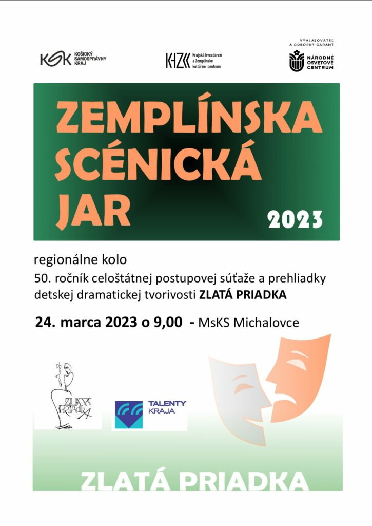 Michalovce: Krajská hvezdáreň a Zemplínske kultúrne centrum Michalovce je z poverenia Národného osvetového centra v Bratislave organizátorom regionálneho kola postupovej súťaže a prehliadky detskej dramatickej tvorivosti Zemplínska scénická jar – Zlatá priadka. Regionálna prehliadka a súťaž sa bude konať v priestoroch veľkej sály MsKS v Michalovciach 24.3. 2023 o 9,00 hod.