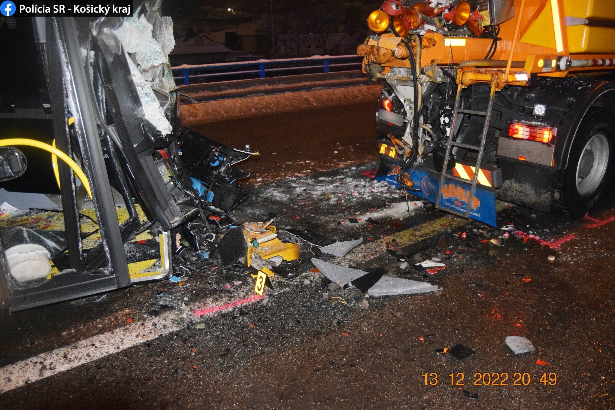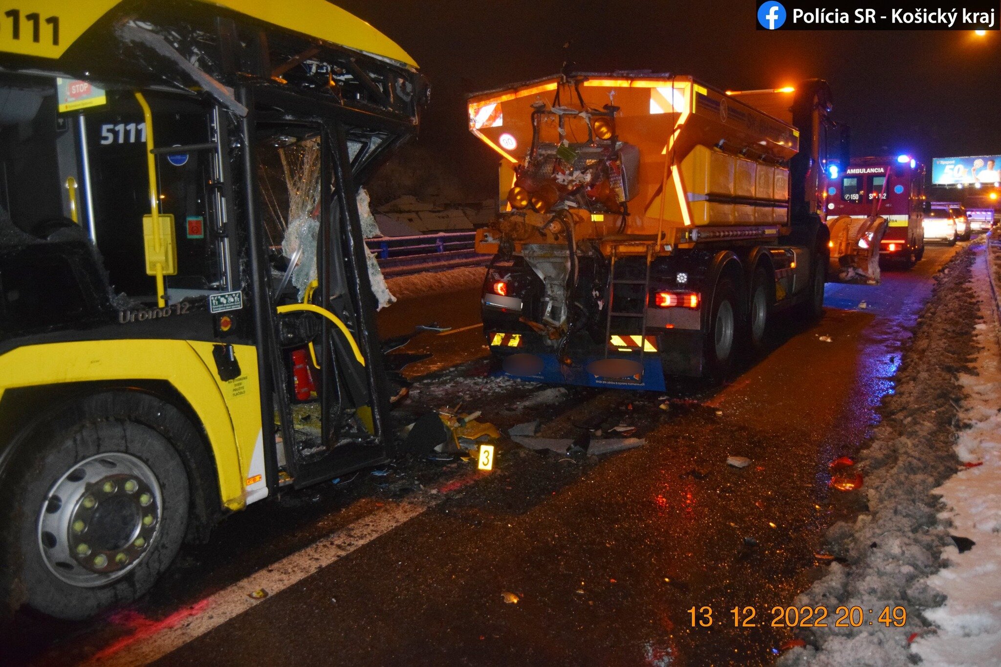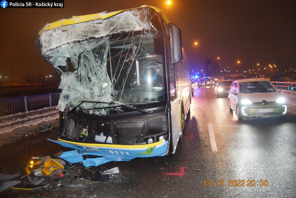V utorok večer viedol 34-ročný vodič autobus mestskej hromadnej dopravy v pravom jazdnom pruhu v smere od Palackého ulice v Košiciach na Južné nábrežie, pričom sa pravdepodobne dostatočne nevenoval vedeniu autobusu a sledovaniu situácie v cestnej premávke, a jeho prednou časťou narazil do zadnej časti svetelne označeného odstaveného nákladného vozidla, tzv. posypovača. „V autobuse sa v tom čase nachádzalo niekoľko cestujúcich, po náraze 7 z nich spadlo na podlahu autobusu. Podľa predbežných lekárskych správ 16-ročný cestujúci utrpel ľahké zranenia, ktoré si nevyžiadali dobu práceneschopnosti, 2 z cestujúcich (13, 72) utrpeli ľahké zranenia, 18-ročný cestujúci utrpel zranenia s predpokladanou dobou liečenia 10 dní, 2 cestujúci (36, 54) sa zranili iba ľahko. Najhoršie však dopadla 58-ročná cestujúca, ktorá pri páse utrpela zranenia ťažkého charakteru a doba jej liečenia a práceneschopnosti sa odhaduje na viac ako 42 dní. Vodič autobusu pri náraze utrpel ľahké zranenia s dobou liečenia do 7 dní, vodič posypovača sa pri dopravnej nehode nezranil,“ uviedla polícia.