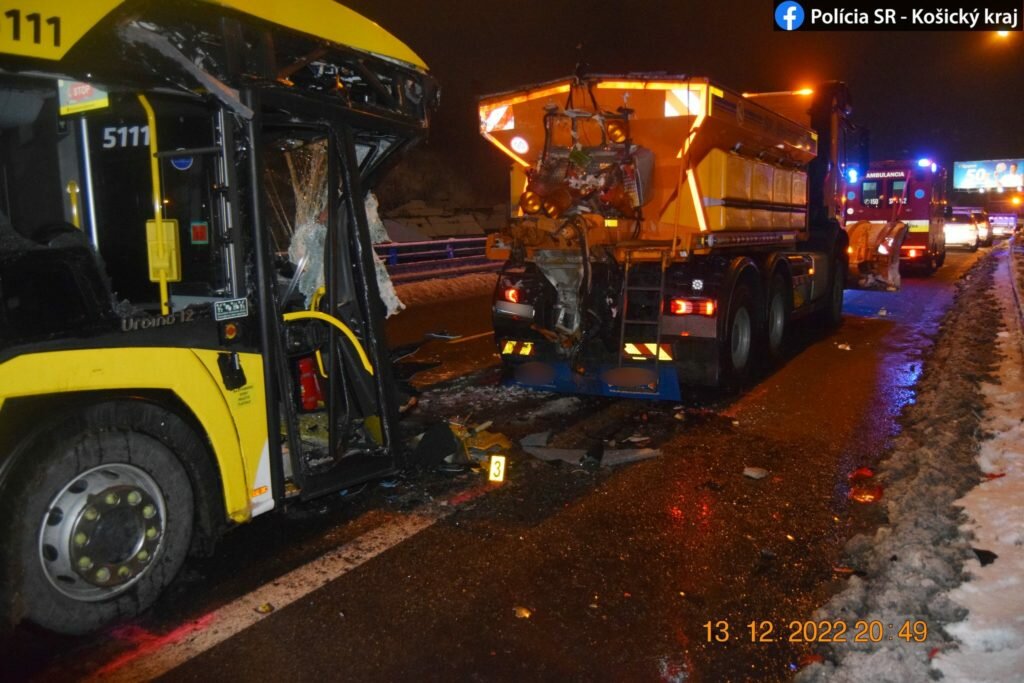 14.12.2022. KOŠICE. Sedem ľudí utrpelo v utorok (13.12.) v Košiciach zranenia po tom, ako autobus mestskej hromadnej dopravy (MHD) narazil do posýpača. Informuje o tom košická krajská polícia na sociálnej sieti.